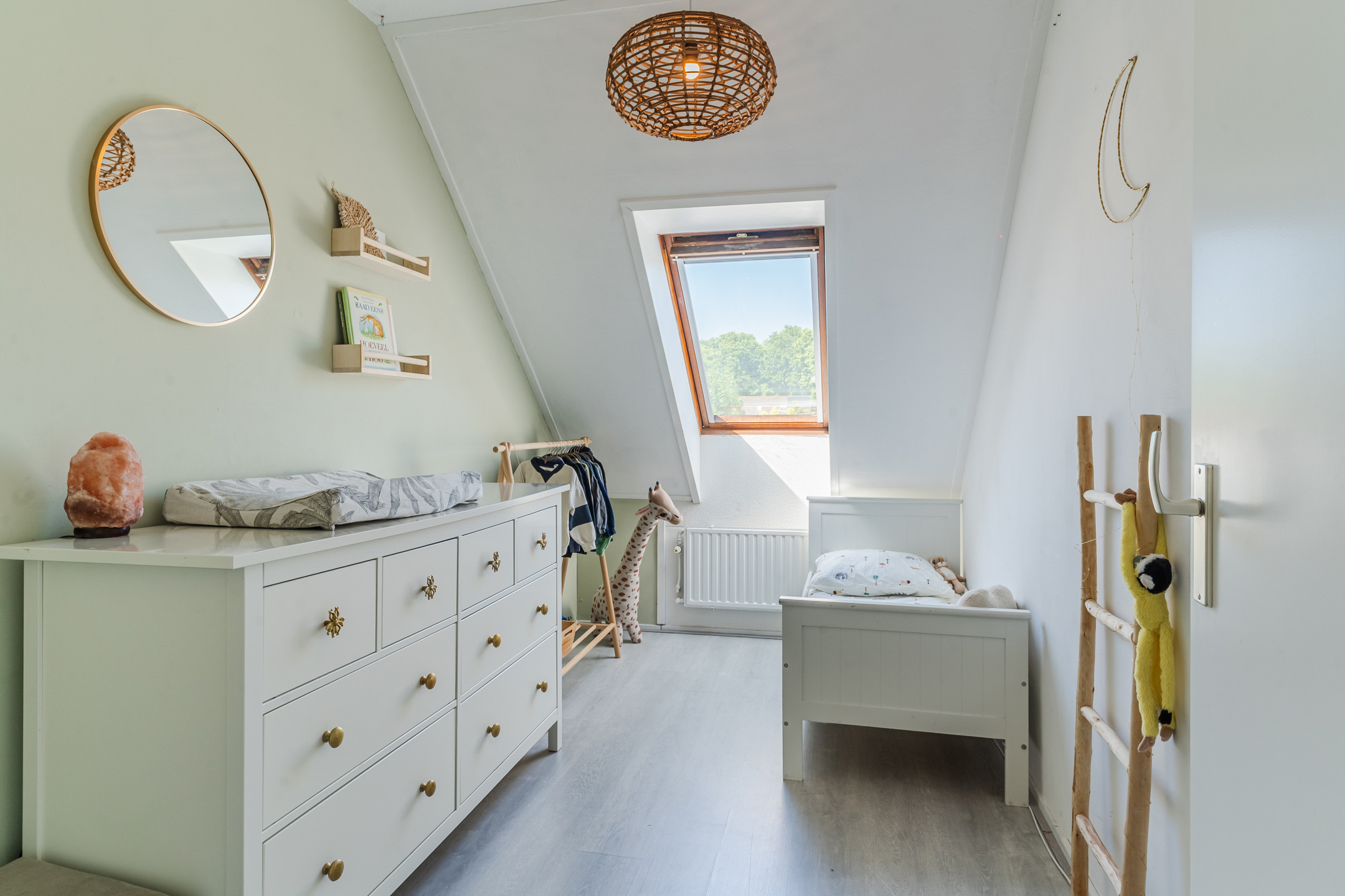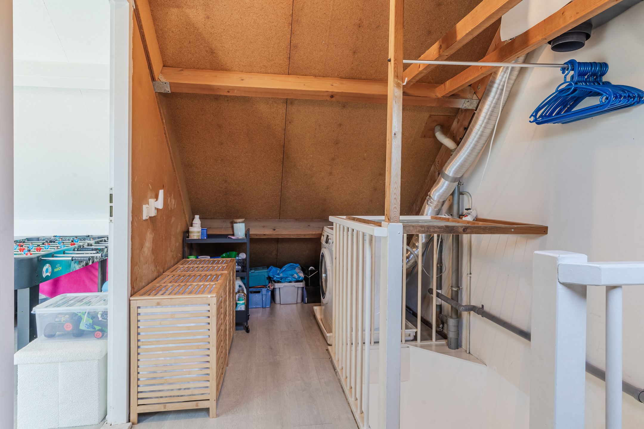 Via een vaste trap kom je op de ruime voorzolder van de tweede verdieping met de aansluiting voor de wasmachine en bergruimte achter de schotten. Daarnaast toegang tot een royale zolderkamer met velux dakraam. Ideale vierde slaapkamer voor pubers of als thuiswerkplek.