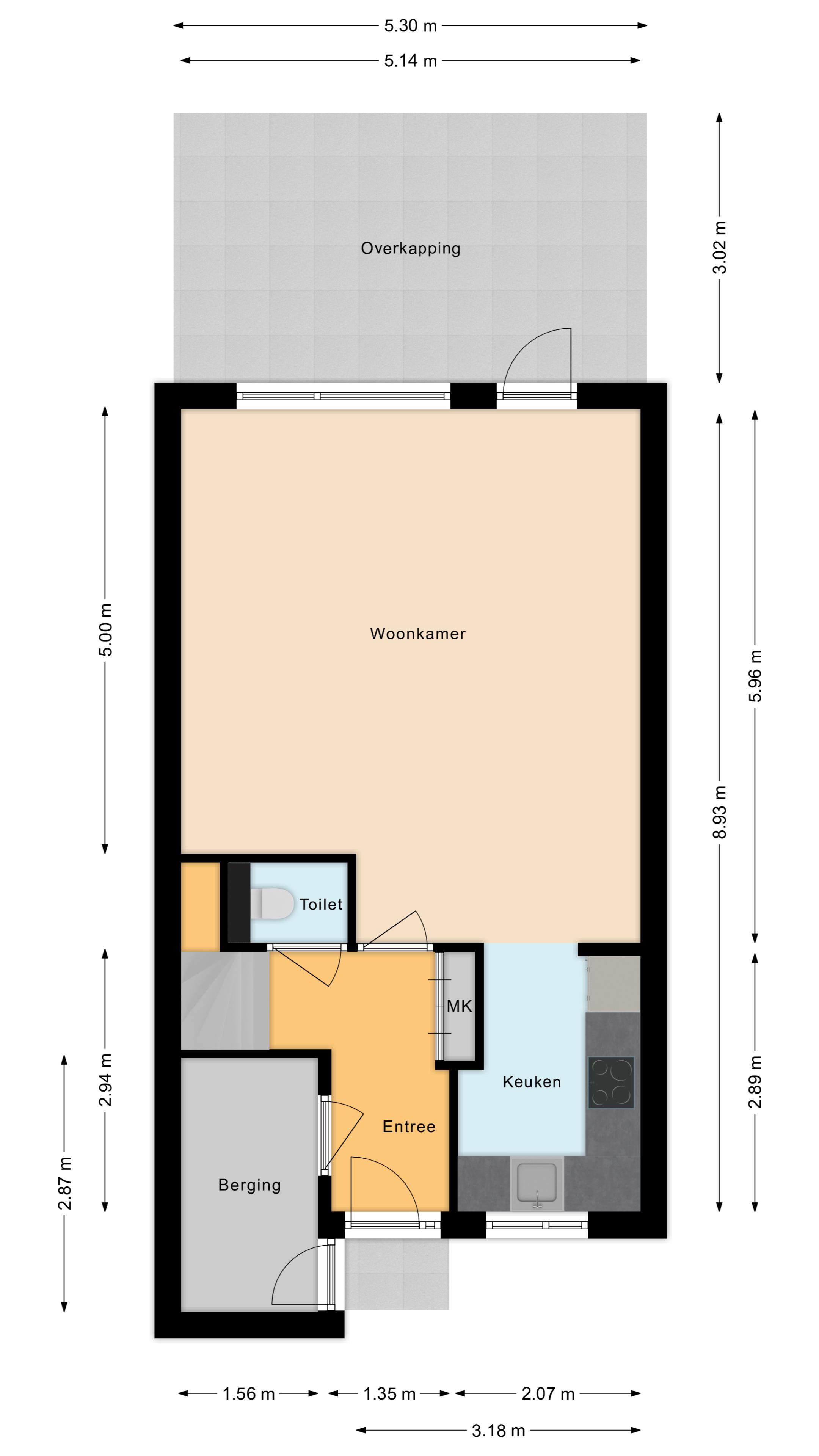 Vanuit de hal kun je naar de berging, het toilet en de woonkamer. De woonkamer is ruim en licht met aan de voorzijde de open keuken voorzien van vaatwasser, koelkast, combi-oven, kookplaat, afzuigkap en verlaagd plafond met inbouwspots. De gehele begane grond is voorzien van strak stucwerk en gietvloer. Via de achterdeur bereik je de zonnige tuin met overkapping, gelegen aan het water.