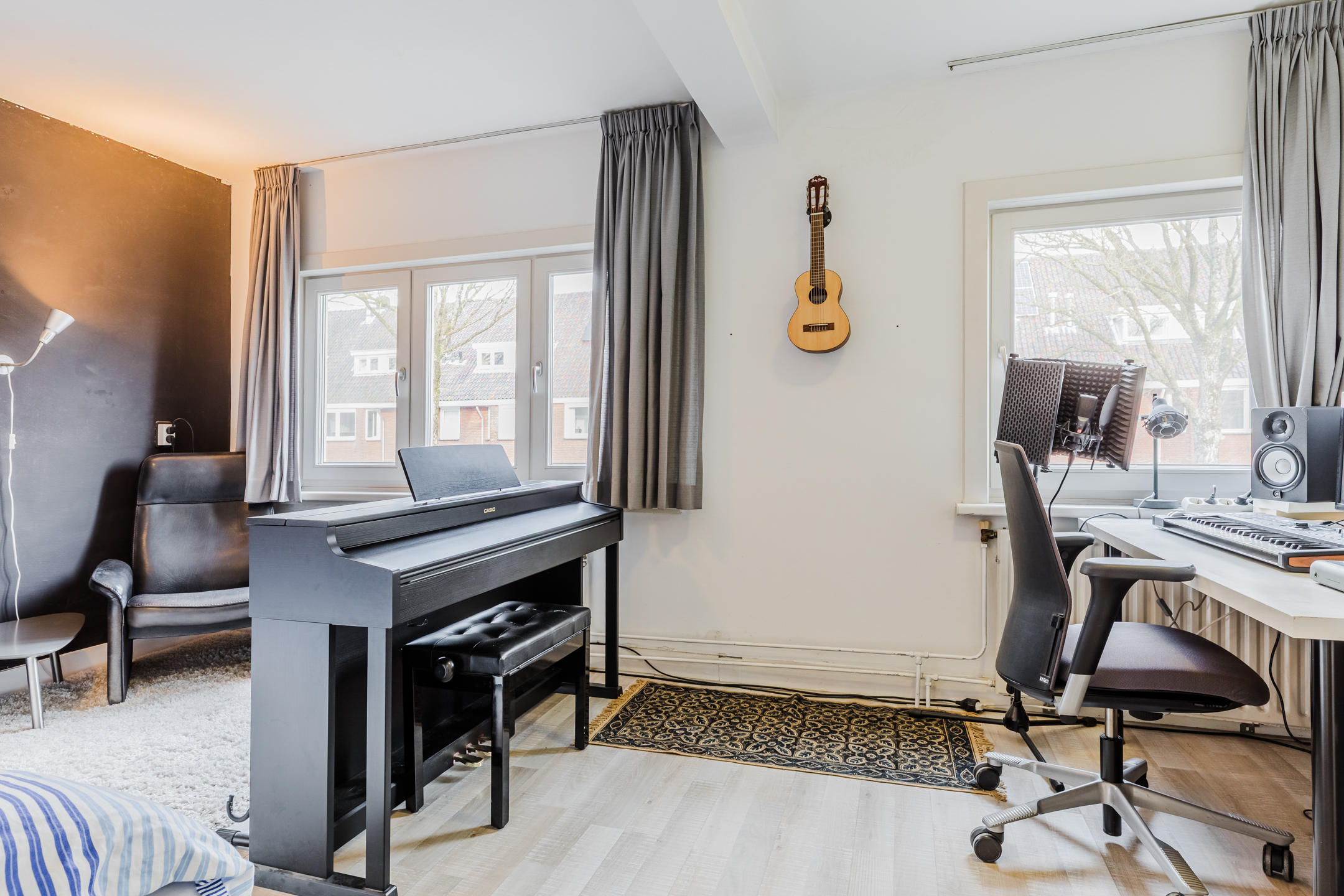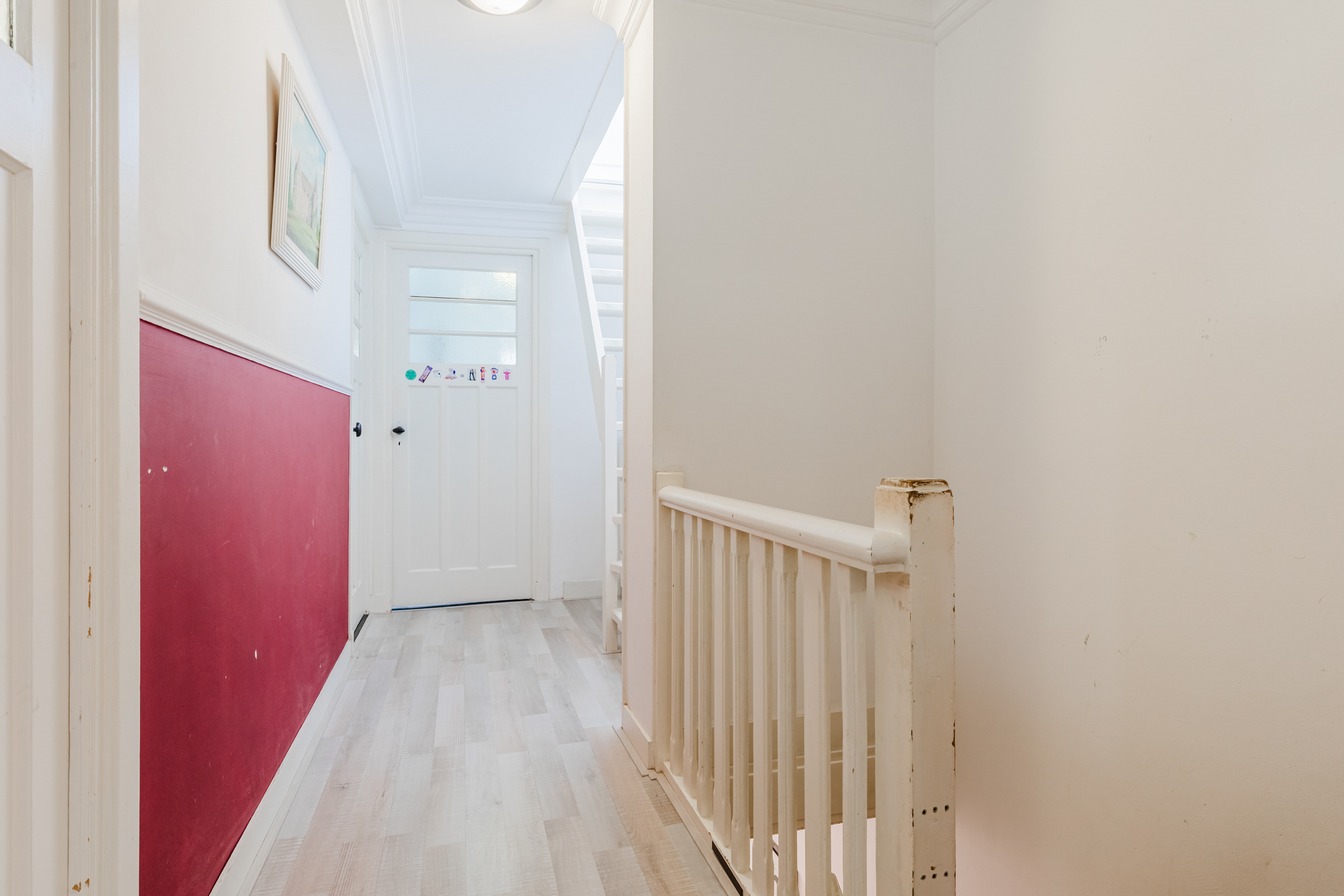 Woonkamer: De heerlijke woonkamer met hoge plafonds en erker met glas in lood ramen strekt zich uit over de gehele lengte van het huis. Hier is ruimte genoeg voor een grote eettafel en een royale zithoek. Aan de achterzijde heb je uitzicht op de zonnige achtertuin. Onder de trap bevinden zich de meterkast en de voorraadkast. De muren en plafonds zijn voorzien van strak stucwerk.