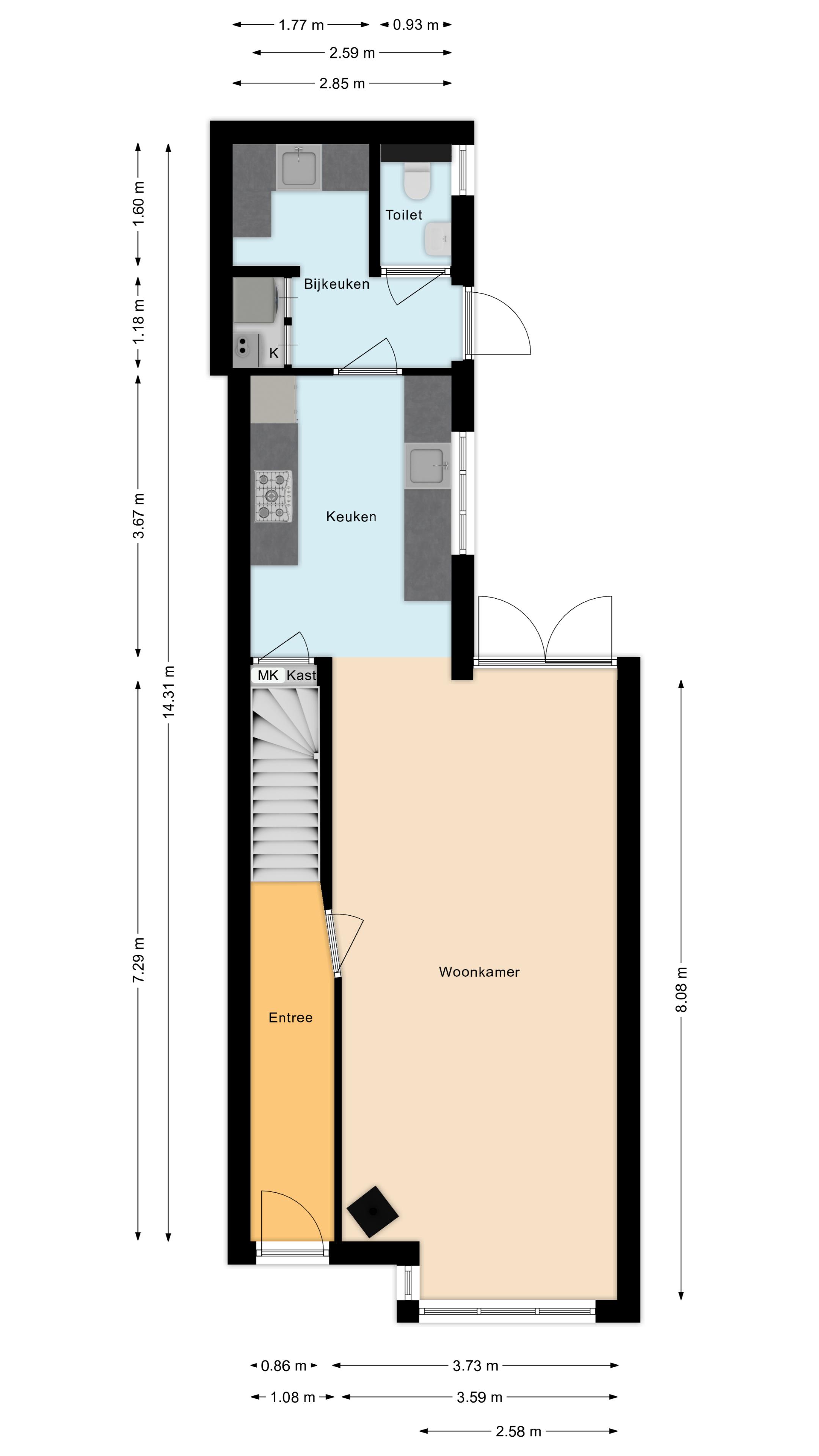 * De NEN 2580 meetnorm is een eenduidige meetnorm, waarbij met bepaalde richtlijnen rekening gehouden wordt. Zo wordt o.a. een zolder zonder vaste trap of met een lichtoppervlakte (bv dakraam) kleiner dan 0,5 m² niet tot de woonoppervlakte gerekend. Hierdoor kan de woonoppervlakte soms kleiner lijken dan de daadwerkelijke vloeroppervlakte en kleiner lijken dan bij vergelijkbare woningen waar de makelaar de meetnorm niet toe heeft gepast. Ondanks het feit dat de meetnorm verplicht is, hanteren niet alle makelaars consequent de norm. MTB Makelaardij laat haar woningen inmeten door een erkend bedrijf. Het meetrapport van deze woning is dan ook, indien gewenst, ter inzage.
