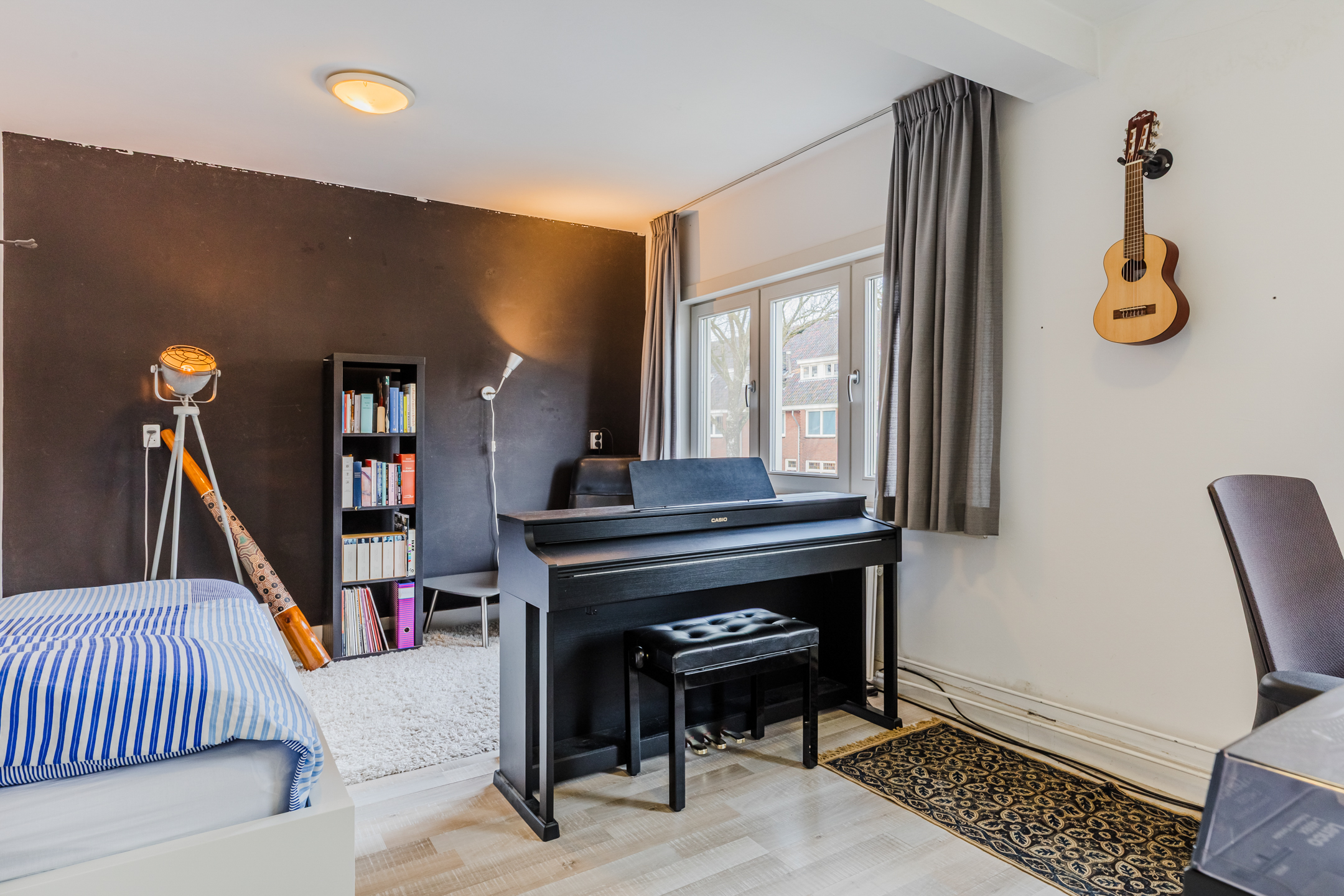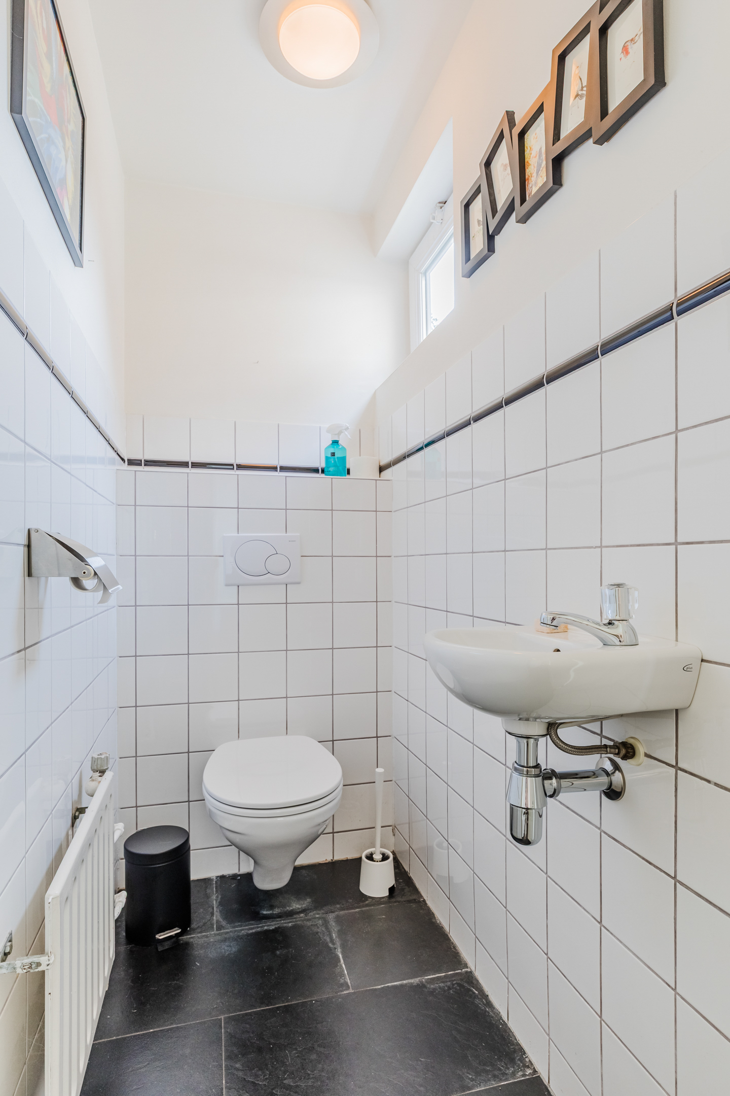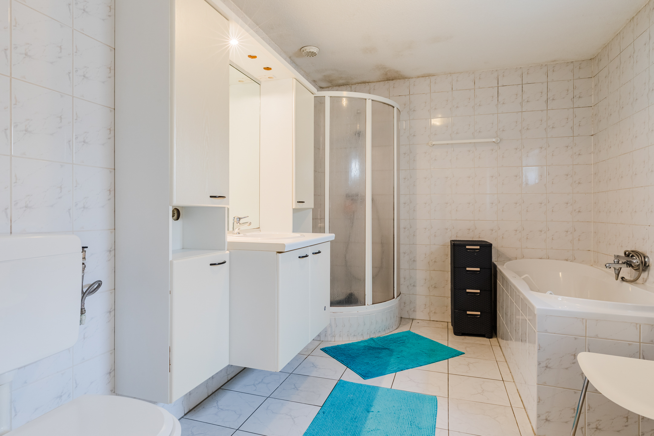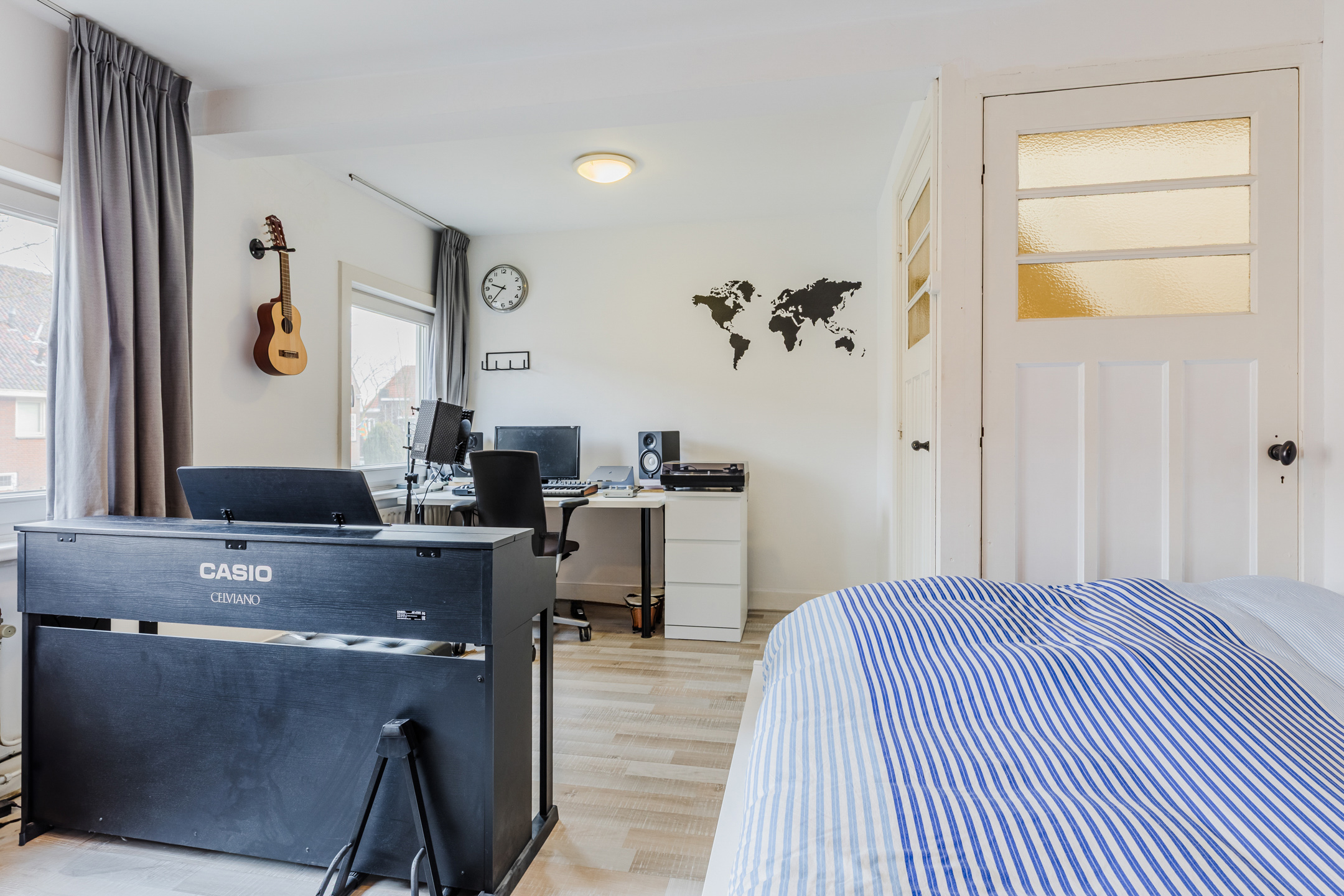 Via de vaste trap bereik je de eerste verdieping. Hier bevinden zich 2 slaapkamers, de badkamer en een ruime overloop. De "masterbedroom" (voorheen 2 kamers) bevindt zich aan de voorzijde van de woning, waardoor hier tevens ruimte is voor een fijne werkplek. De muren en plafonds zijn ook hier voorzien van strak stucwerk. Op de uitbouw bevindt zich de grote badkamer die volledig betegeld is en beschikt over een wastafelmeubel, toilet, ligbad en douchecabine. Hier kom je heerlijk tot rust na een drukke dag.
