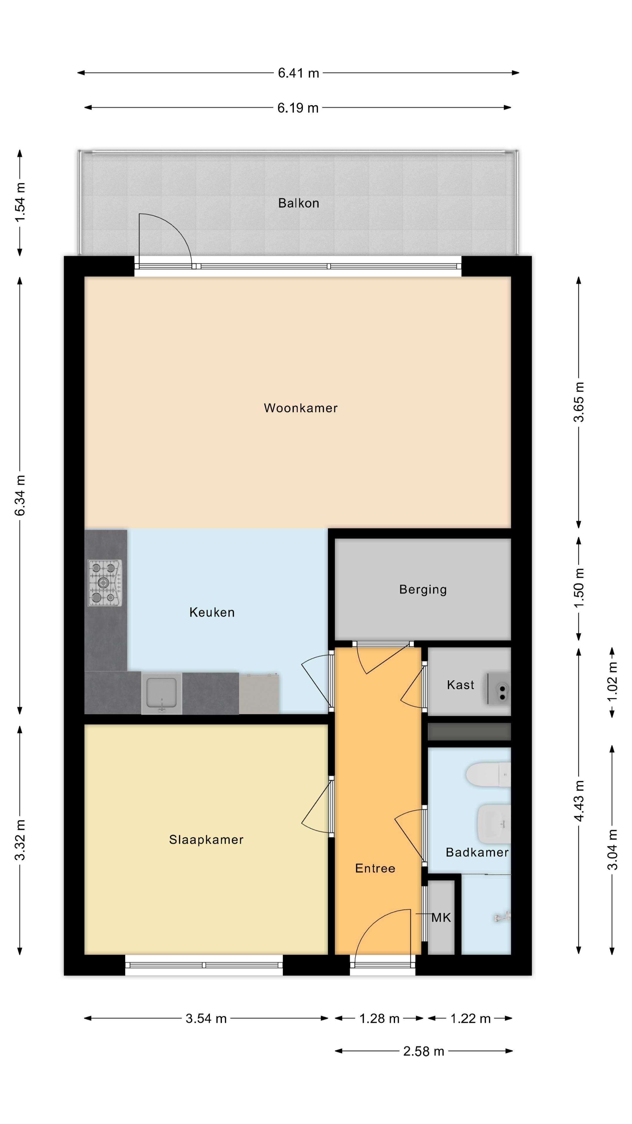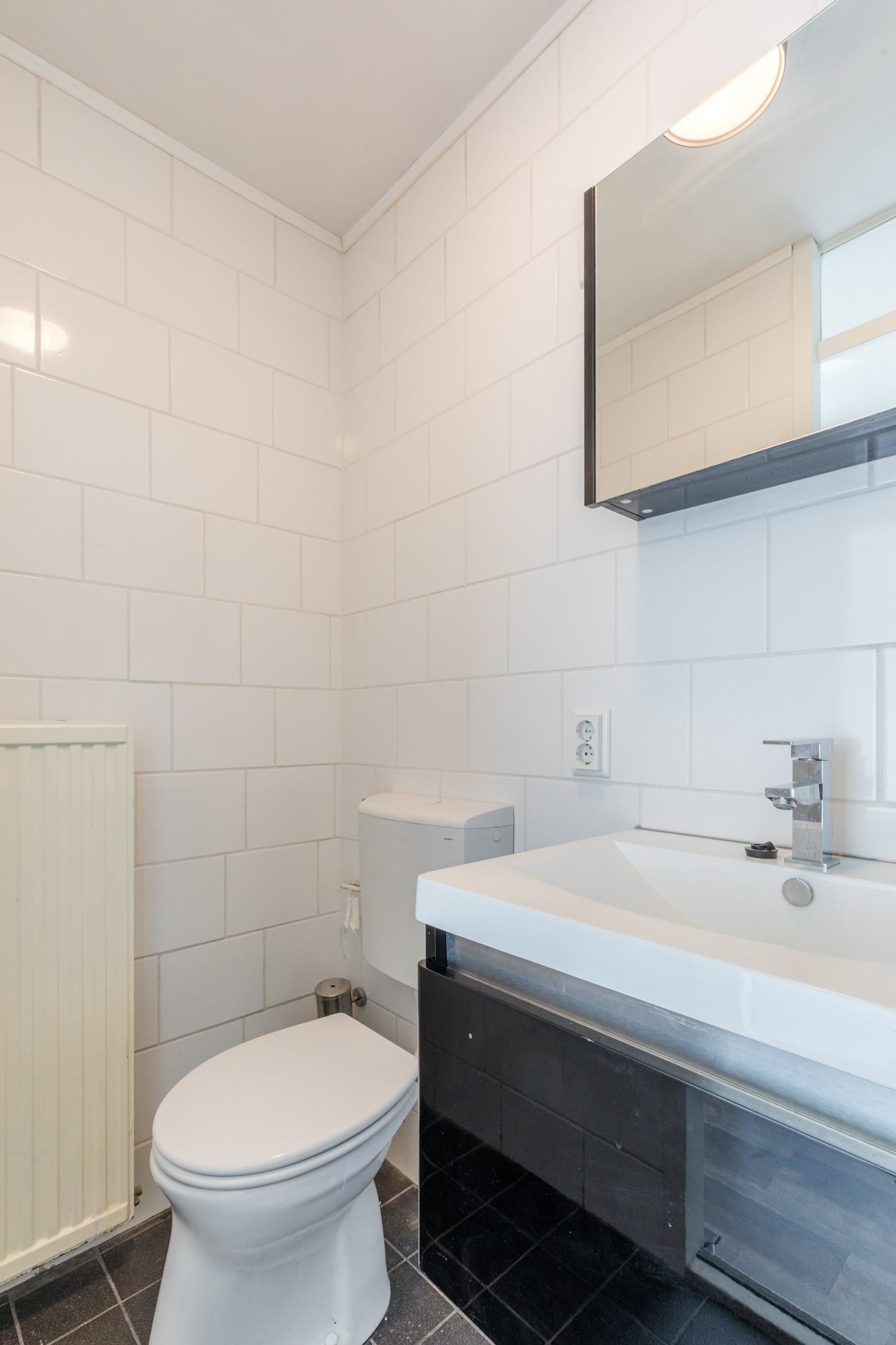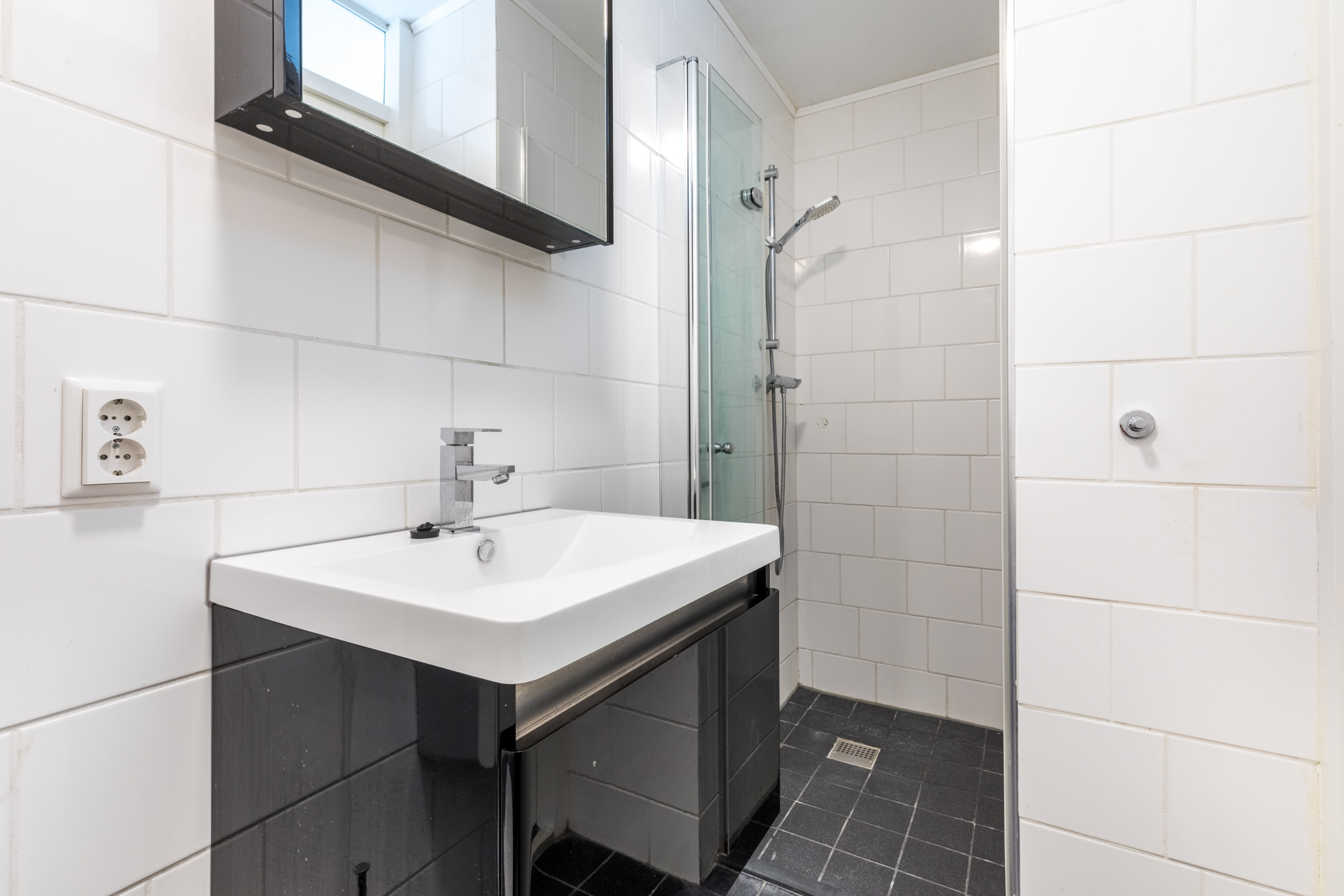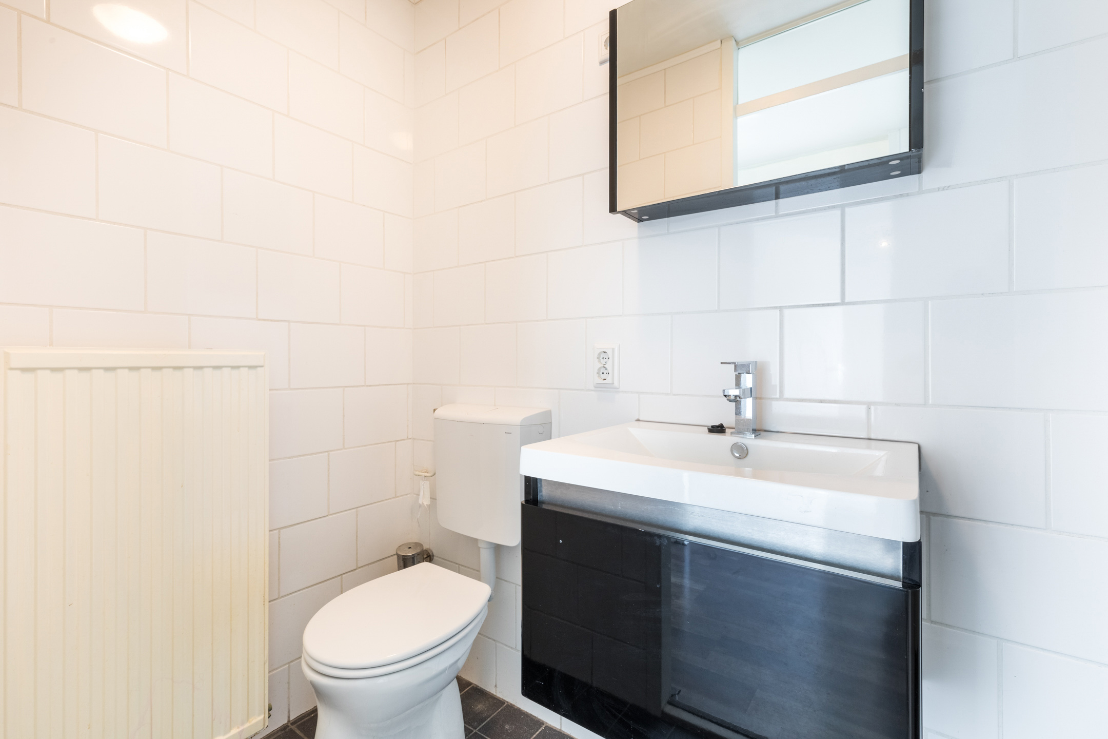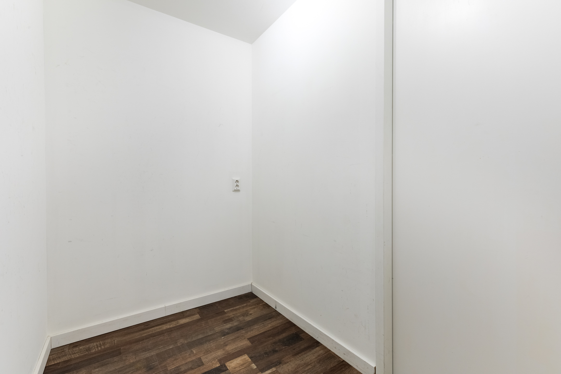 Wanneer je de voordeur van het appartement opent, kom je terecht in de nette hal. Hier spot je meteen de nette laminaat vloer die doorgetrokken is in het gehele appartement. De hal biedt toegang tot de meterkast, ruime slaapkamer, betegelde badkamer met douche, toilet en wastafel met spiegel, stookruimte met Cv-ketel en aansluiting wasmachine. Tenslotte bevind zich in de hal een kamer die gebruikt kan worden als bergruimte of eventueel als werkplek.
